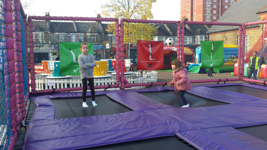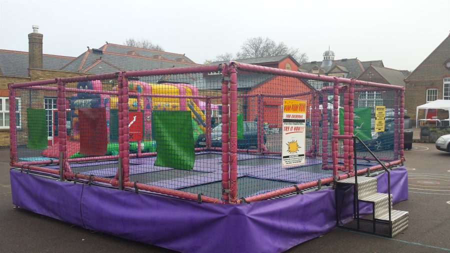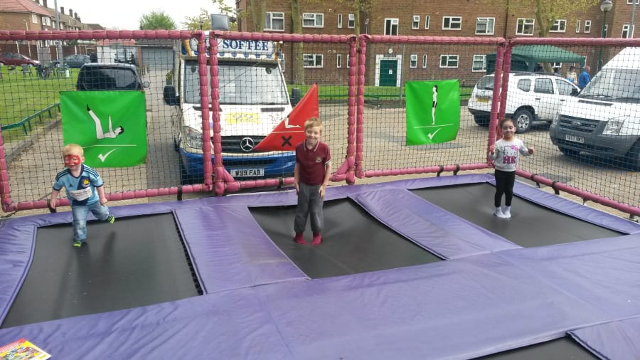 Our children's trampolines are really special. For a start, they are large and rectangular trampolines, not those tiny circular ones you see in people's back gardens.They have six – yes, six! - jumping beds so your little guests can bounce and leap together and have six times the fun. Each trampoline comes with high, netted sides for their safety and to ensure they can be seen at all times. As an added safety feature, the exposed springs around the edge of each trampoline are covered with foam material. Plus, you'll get an onsite supervisor as part of the package.