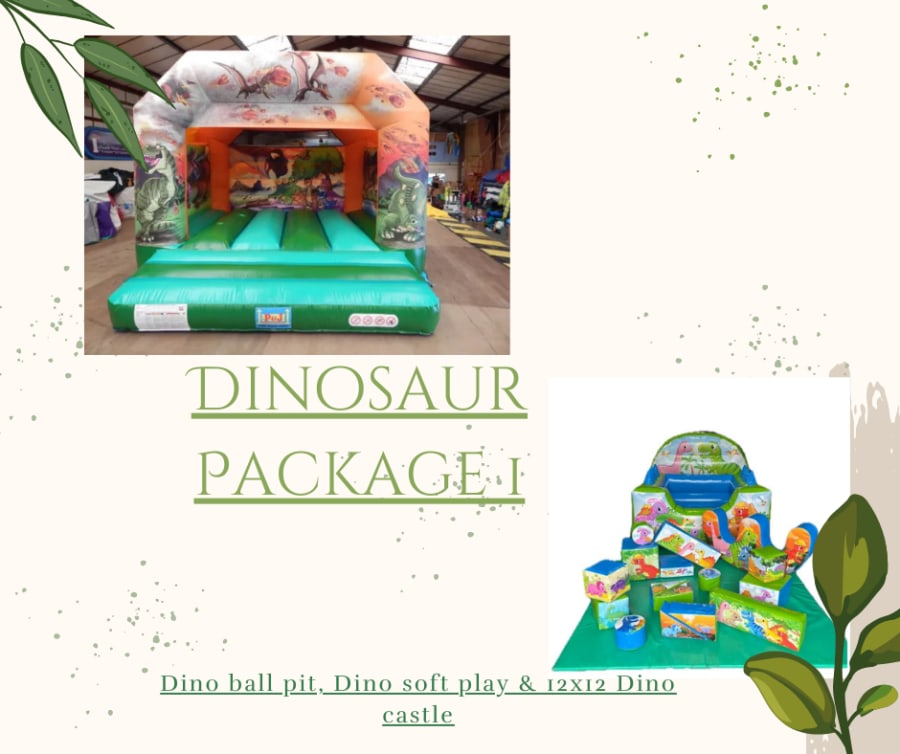 Make your child's birthday roar with excitement. Dino package 1 is a complete dino party package designed for safe, energetic play. It pairs a large 12ft x 12ft bouncy castle with a dinosaur-themed softplay and ball pit. Perfect for toddlers and young children. Fast setup. High fun. Memorable photos. ✅